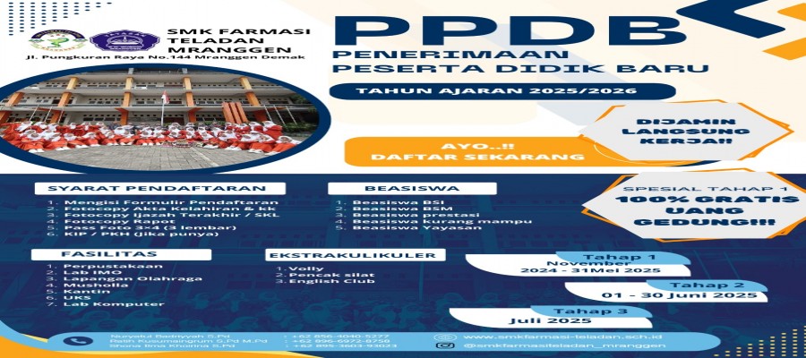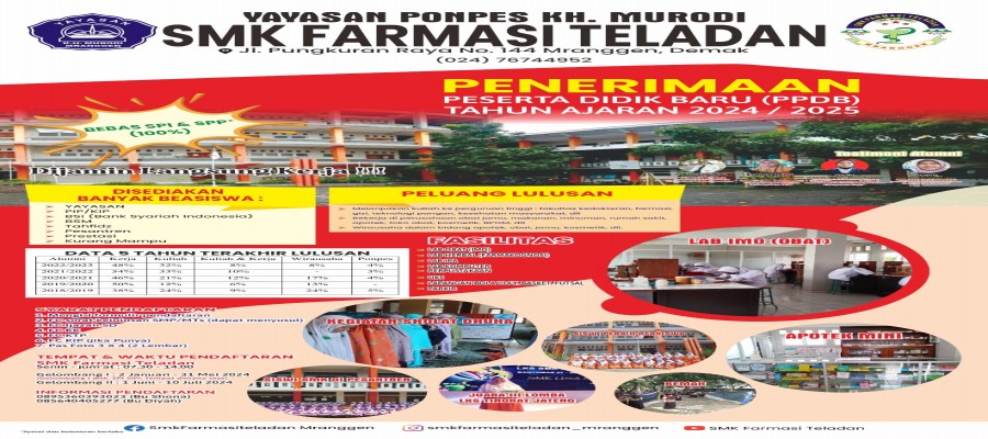 Sistem Penerimaan Murid Baru Tahun Ajaran 2025/2026 Yayasan Pondok Pesantren KH Murodi SMK Farmasi Teladan Mranggen Demak masih membuka untuk pendaftaran di gelomban